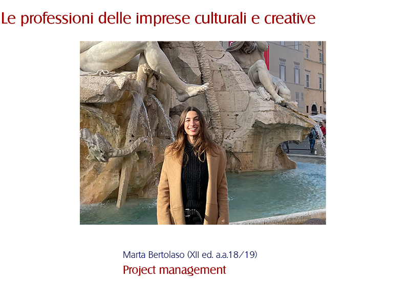 Marta Bertolaso (XII ed. a.a 18/19). A seguito del Master Progettare Cultura ha svolto il tirocinio all'interno di Fondazione per l'Innovazione Urbana di Bologna, realtà dove lavora attualmente come Responsabile della segreteria istituzionale.