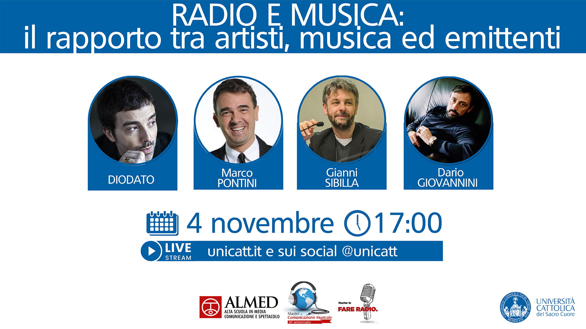 Mercoledì 4 novembre, un webinar in diretta streaming per discutere del rapporto tra artisti, musica ed emittenti radiofoniche. L’incontro, organizzato dai #MasterAlmed Fare Radio e Comunicazione Musicale, vedrà la partecipazione di Diodato, Dario Giovannini, Managing Director at Carosello Records, Marco Pontini, vicepresidente Radio Italia e Direttore Didattico del Master Fare Radio, e Gianni Sibilla, Direttore Didattico del Master Comunicazione Musicale.