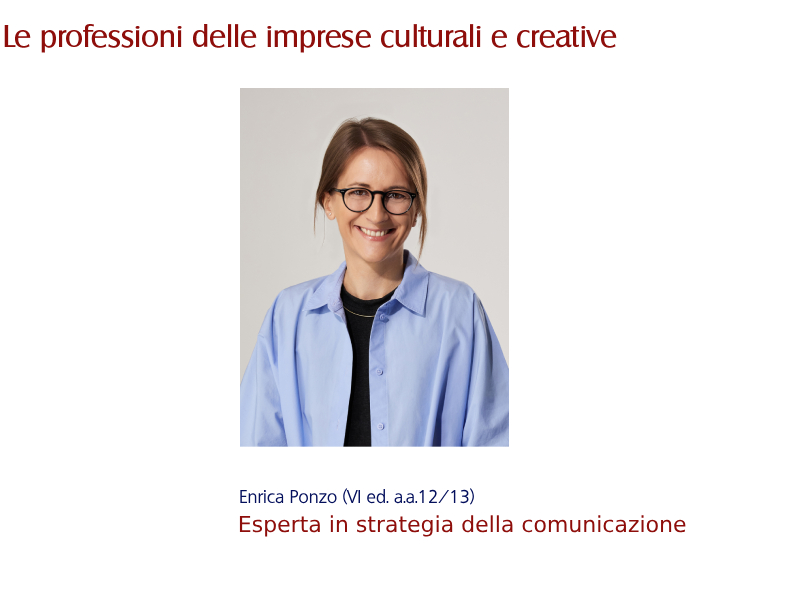 Enrica Ponzo (VI ed. a.a. 2012/13) è Head of Creative Content in Canali. Concluso il Master ha intrapreso la carriera nel mondo della moda lavorando per aziende come Zegna, Bottega Veneta e Bally. Si è specializzata inizialmente in ambito digital per poi approdare alla creazione e produzione di contenuti creativi a supporto della comunicazione e del marketing.