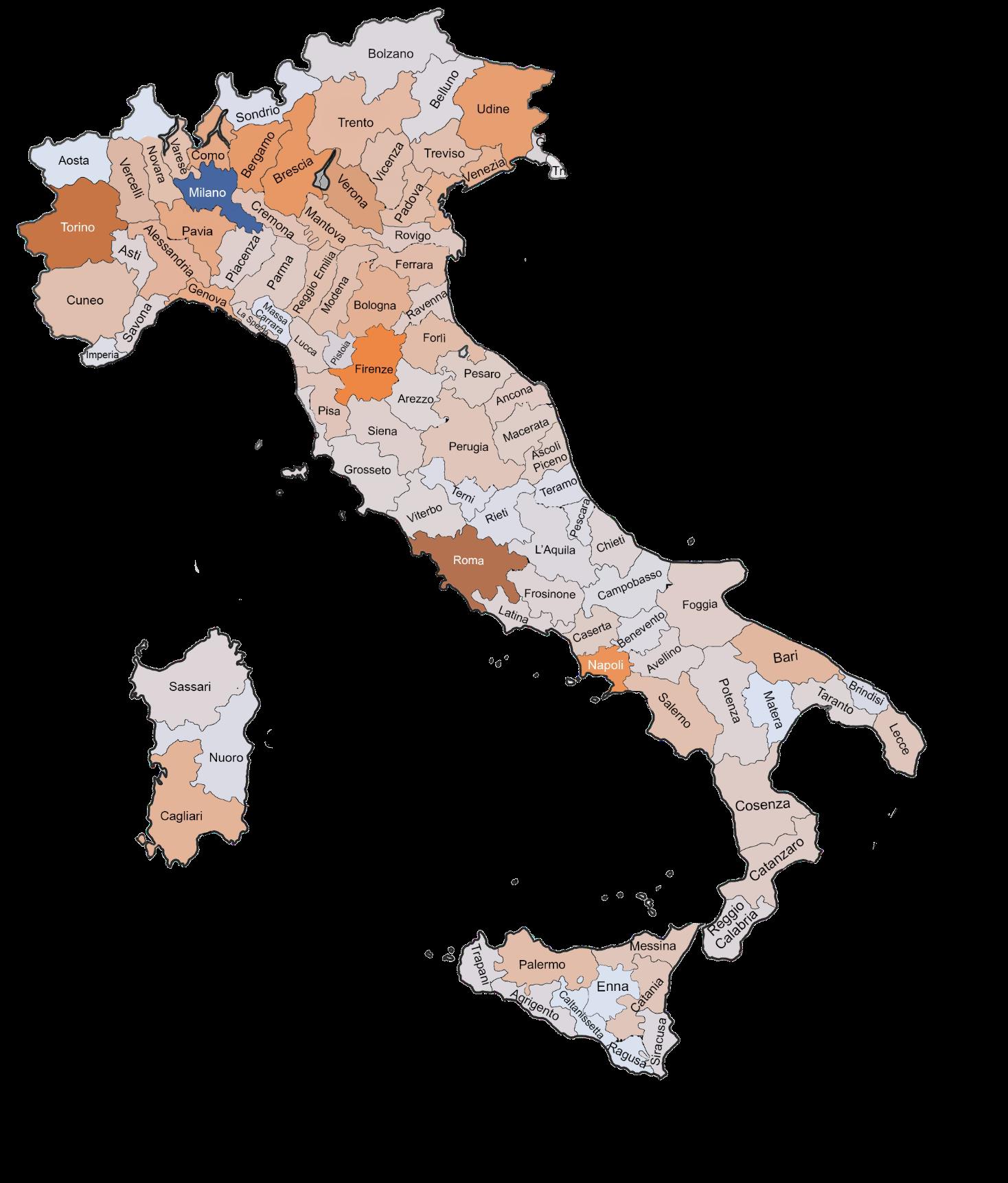 Mappa termica relativa alla distribuzione delle sale a livello provinciale nel 1955 realizzata manualmente a partire dai confini di una mappa geopolitica del 1947.